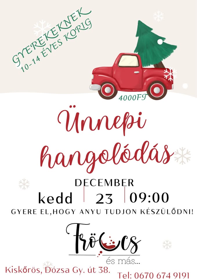 Ünnepi hangolódás gyerekeknek 2025-12-17 Kiskőrös, Dózsa György út 38. , 2025. december 23. 09:00 - 12:00 Facebook esemény