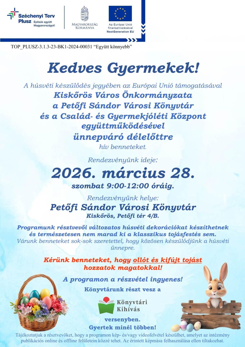 Petőfi Sándor Városi Könyvtár, Kiskőrös, Petőfi tér 4/B, 2026. március 28. 09:00 - 12:00
