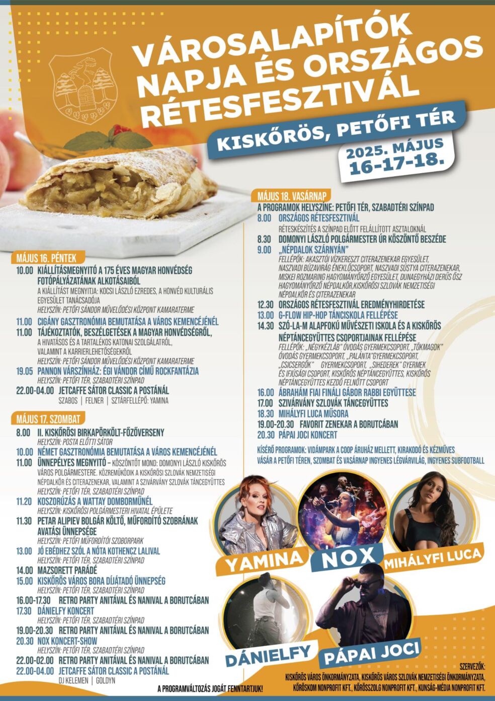 Városalapítók Napja és Országos Rétesfesztivál 2025-04-15 Kiskőrös, Petőfi tér, 2025. május 16. 00:00 - 23:59