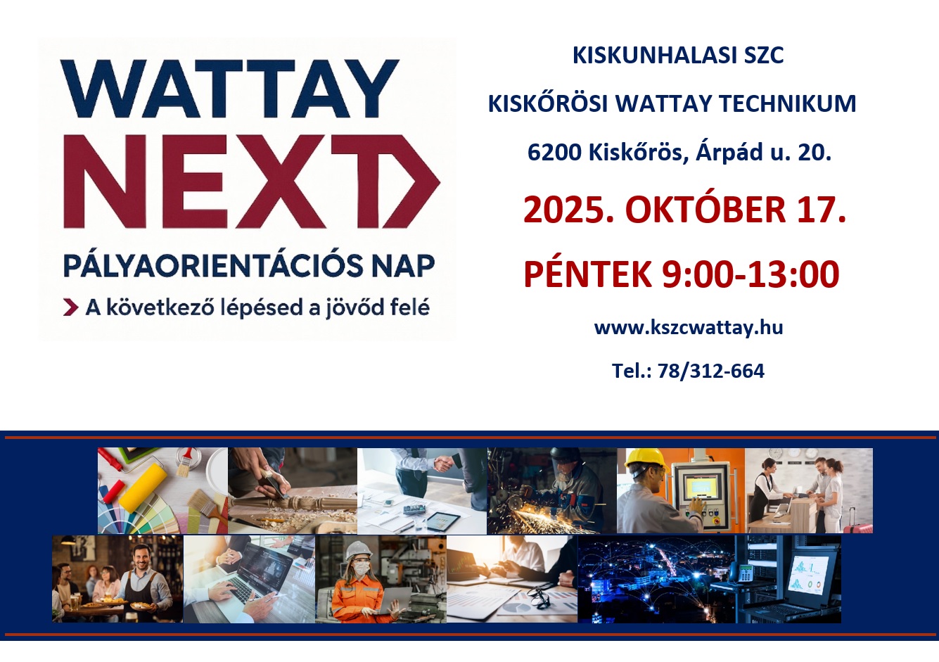 Wattay NEXT Pályaorientációs nap 2025-10-15 Kiskőrös, Árpád u. 20., 2025. október 17. 09:00 - 13:00 Facebook esemény