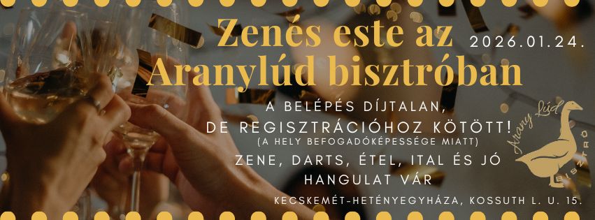 Zenés este az Aranylúd bisztróban 2026-01-21 Kecskemét, Kossuth Lajos utca 15., 2026. január 24. 19:00 - 23:00 Facebook események
